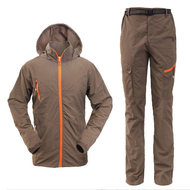 Camping Hiking Clothing Set Outdoor Sport Men Women Summer Sportswear Suit Hooded Jackets Pants Quick Dry Breathable Set ST01 – Men Brown, 4XL
