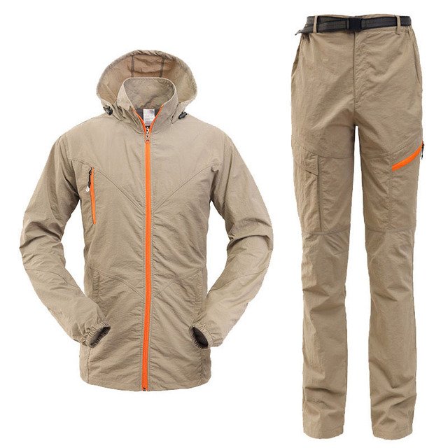 Camping Hiking Clothing Set Outdoor Sport Men Women Summer Sportswear Suit Hooded Jackets Pants Quick Dry Breathable Set ST01 – Men Khaki, 4XL